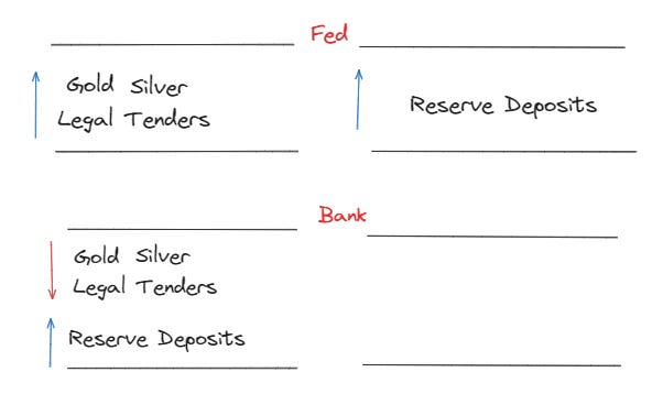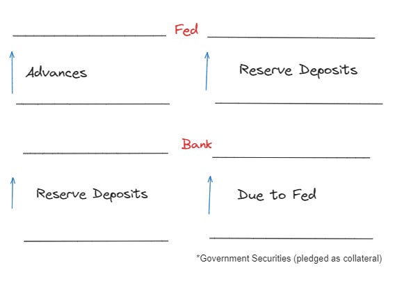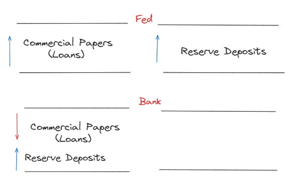 Subsequently, the Fed began creating reserves through a discount mechanism. The following illustration shows how this mechanism worked in the Fed’s balance sheet.