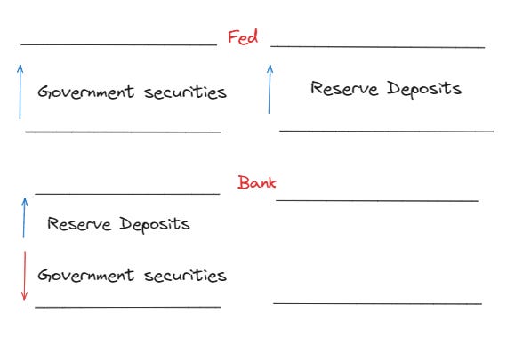 The Fed pays for these securities by increasing the member bank’s reserve deposits. This appears as an increase in both the assets and liabilities for the Fed.