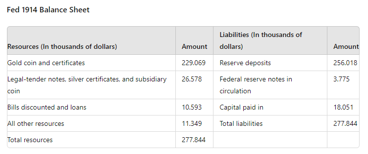 This is the Federal Reserve's first balance sheet, published8 on December 31, 1914. In the following table, I have combined the asset and liability items.