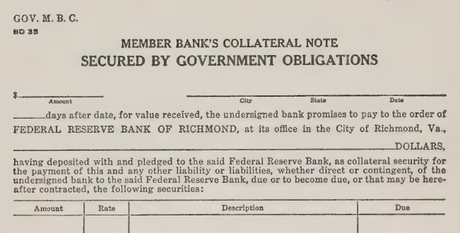 The mechanics of borrowing on Governments is simple. The borrowing bank merely sends in an executed note and application form to Federal Reserve Bank.