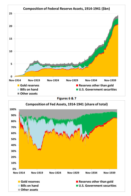 This is the composition of the Fed’s assets7 in the balance sheet between 1914-1941. Total gold reserves made up almost 84 percent of assets when the Fed opened in November 1914, declining to less than 40 percent in 1918 as the Fed’s total bills on hand increased and it shrank to nearly nothing in the end of the 1934.