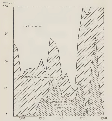One of the most interesting chapters in the history of the lending functions of the Federal Reserve Banks is that relating to advances to member banks. Both discounts and advances are sometimes loosely referred to as discount operations, but the legal and procedural distinctions between the two are clear. (Heckley : 83) Until September 1916, member banks could borrow from the Federal Reserve banks only by rediscounting customers’ eligible paper. At that time provisions of the Federal Reserve Act were changed to permit advances (not to exceed fifteenday maturities) secured by eligible paper and by Governments. (McKinney :56) The Act was revised in 1916 to permit what was in fact a radical departure from the commercial loan theory—the use of United States Government securities as collateral to borrowings.(McKinney :12) In 1918, over 60% of all loans nationwide were short-term advances. In the following three years (1920, 1921, and 1923), the amount of outstanding loans that were refinanced through banks (rediscounts) reached similar levels to advances. However, since the mid-1930s, rediscounts have been practically unused.