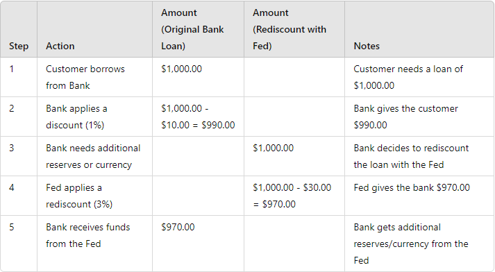 In those days, most short-term bank loans were made on a discount basis (the discount being the difference between the amount borrowed and the amount repaid on a loan). When a member bank desired to acquire additional reserves or currency, it would “rediscount” some of those loans with its Federal Reserve Bank. The transaction was called a rediscount because the Reserve Bank would pay out a smaller amount (the discount) of currency or reserves to the member bank than would ultimately be repaid to the Fed when the loan matured. When the rediscounted loans approached maturity, the Reserve Bank would return them to the member bank for collection. Upon maturity the bank’s reserve account with the Fed would be charged for the full amount of the original loan.3