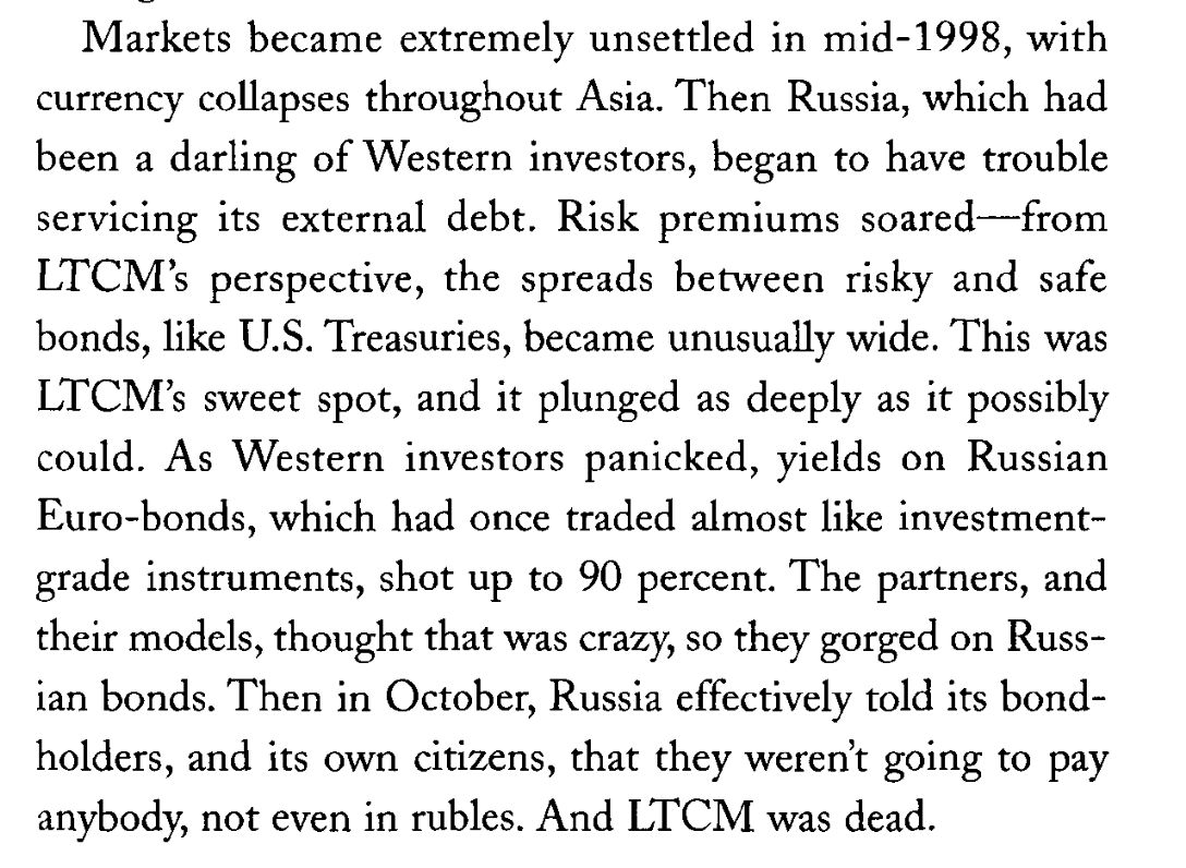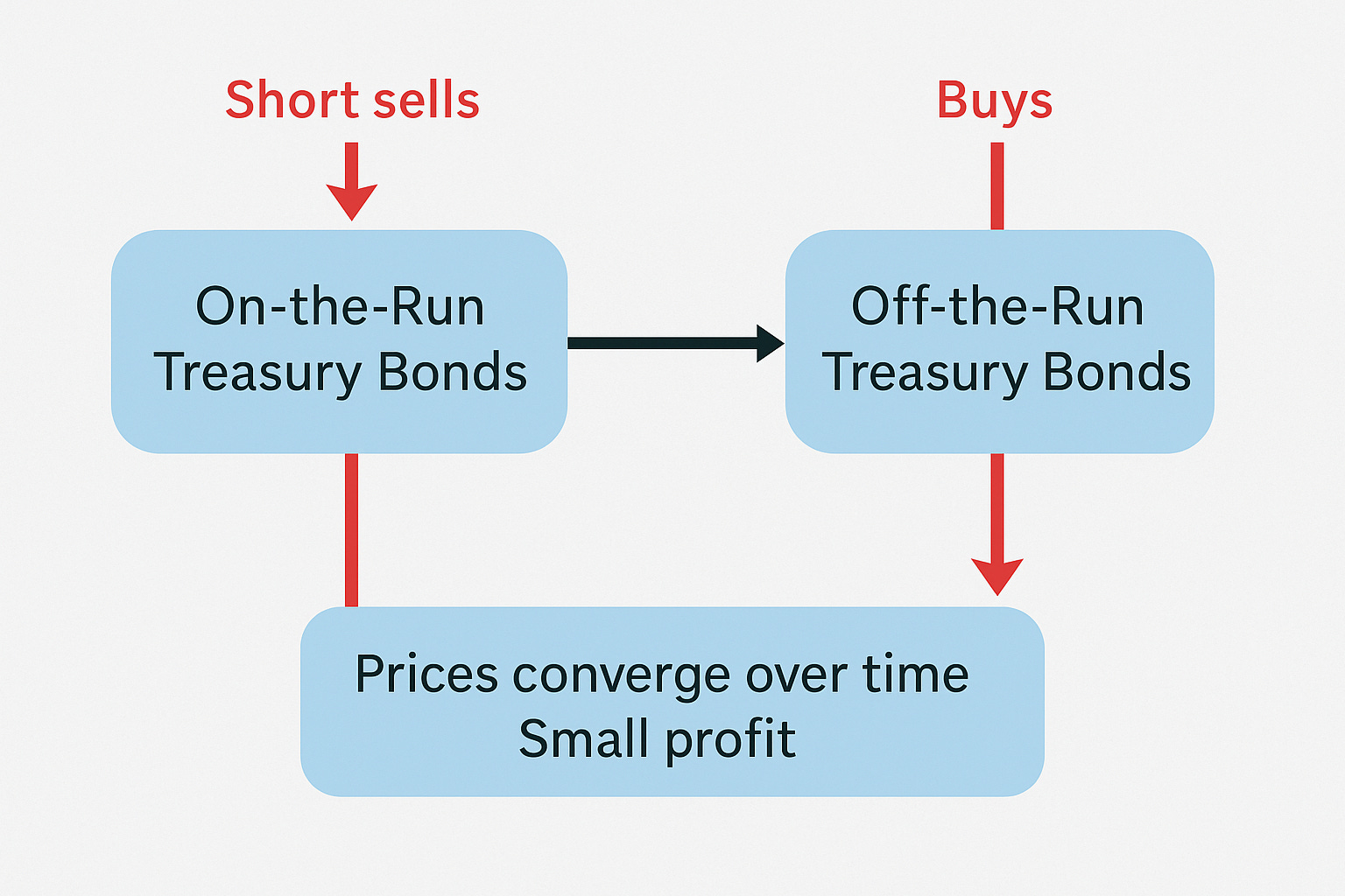 They focused on arbitrage trades like the spread between newly issued (on-the-run) and older (off-the-run) Treasury bonds — selling the newer ones and buying the older ones, expecting their prices to converge over time. This strategy aimed for low-risk, steady profits, since overall market movements didn’t matter — only the relative price difference. According to financial models like Black-Scholes, big deviations from this pattern were expected to be rare.