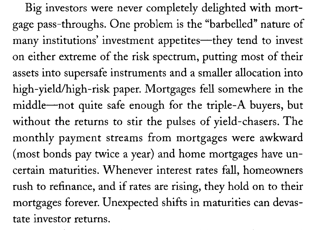 The New Deal adopted S&Ls, or savings-and-loan banks, as the linchpin of its strategy for broadening opportunities for home ownership. To keep S&Ls in lendable funds, the government also created quasi-federal agencies-Fannie Mae, Ginnie Mae, and Freddie Mac-that could liquefy local lending markets by buying up mortgages from S&Ls and other qualified lenders. The agencies in turn learned to maintain their own liquidity by selling mortgage-backed securities, or mortgage pass-throughs. A pass-through is created by transferring a slug of mortgages to a trust, which in turn issues certificates representing a pro rata slice of all the principal and interest it receives. (P:38)
