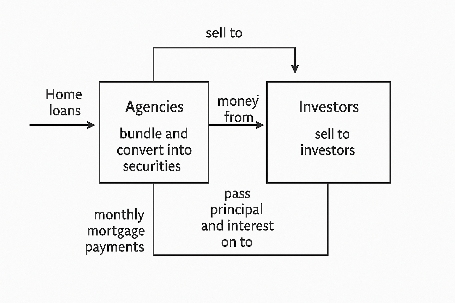 The agencies buy home loans from banks, then bundle and convert them into securities that they sell to investors. The money from these investors goes back to the banks, allowing them to issue new loans. Over time, the banks collect monthly mortgage payments from homeowners and send those payments to the agencies, which then pass the principal and interest on to the investors.